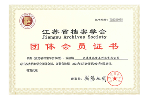 江苏省档案学会团体会员证书